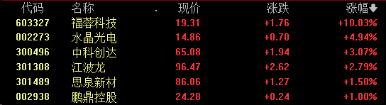 截止午盘,福蓉科技封涨停板,水晶光电涨超4%,中科创达、思泉新材、江波龙等跟涨。