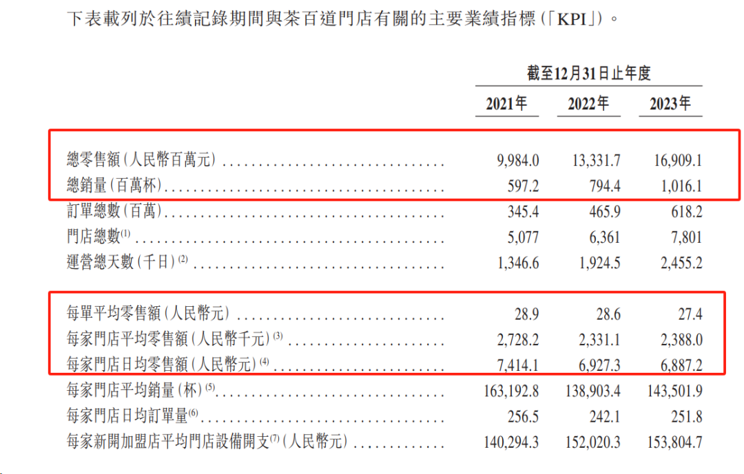 凭借全国近8000家门店布局,2023年茶百道门店总零售额达到169亿元(单位:人民币,下同),共卖出10.16亿杯,每单平均零售额为27.4元,每家门店平均零售额238.8万元,日均零售额6887.2元。