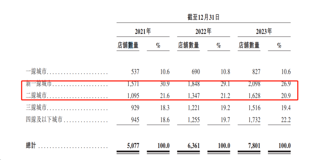 根据最新披露的招股书显示,截至最后实际可行日期(2024年2月18日,下同),茶百道在国内共有7927家门店,逼近8000家,遍布全国31个省市。门店主要布局在新一线城市、二线城市居多,截至2023年度,新一线城市、二线城市门店分别为2098家、1628家,各自占比26.9%、20.9%。