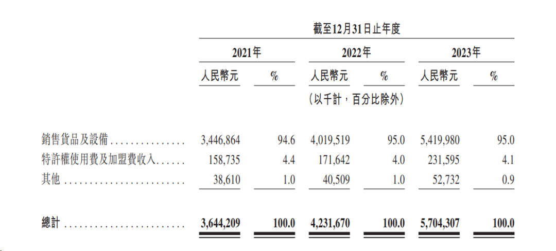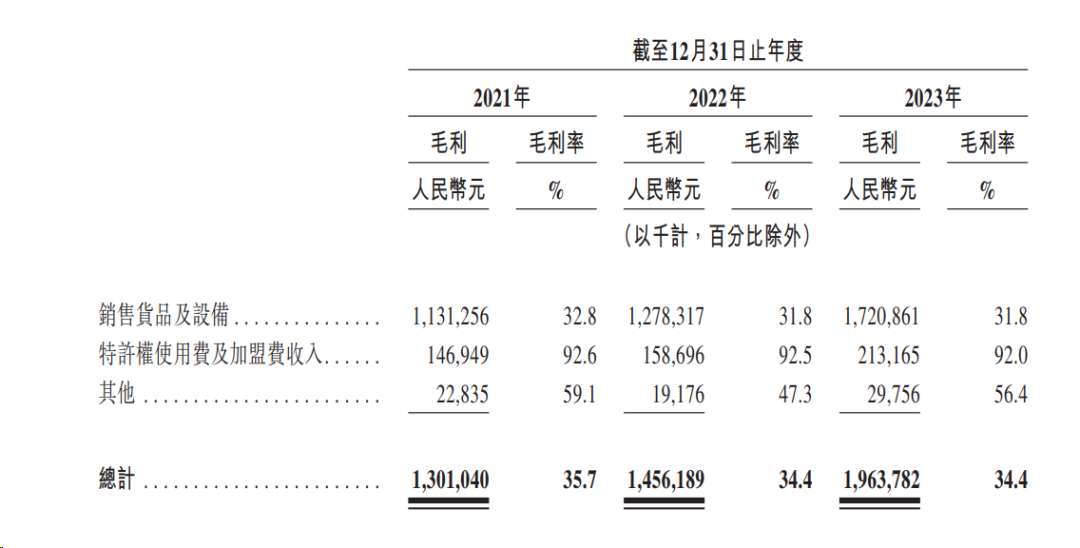 2021年至2023年底,向加盟店销售货品及设备的营业收入分别达到34.47亿元、40.2亿元、54.2亿元,分别占比94.6%、95%、95%,特许权使用费及加盟费收入占比在4%左右,虽然这部分营收占比较小,但是毛利率非常高,常年维持在92%左右。
